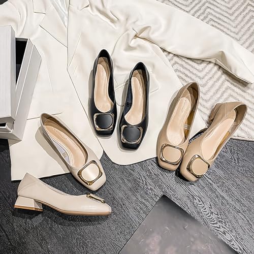 Women's Square Toe Metal Buckle Heels Comfortable Slip On Patent Chunky Low Block Heel Pumps Outdoor Classic Dress Wedding Office Party Shoes 6