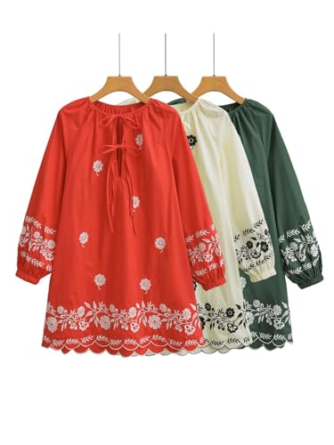 More information about Womens Embroidered Long Sleeve Mini Dress Loose Fit Vintage Embroidery Dress with Double Neckline Self Tie