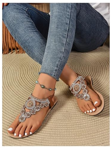 GORGLITTER Women's Rhinestone Boho Summer Western Sandals Glitter Thong Flip Flops Trendy 2025 T-strap Beach Sandals 2