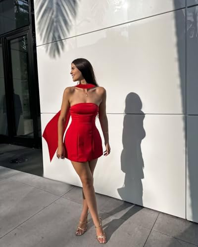 HOT ! MAGGCIF Strapless Satin Homecoming Dresses for Women Short Halter Tight Mini Prom Cocktail Dress with Scarf
