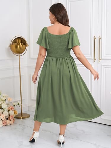 Womens Plus Size Dress Square Neck Smocked Button Down Tie Front Split A-Line Maxi Long Dresses 4