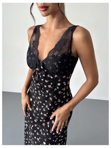 • Feature: Ditsy Floral Print, Lace, V Neck, Sleeveless, Slit Thigh, Long Maxi Length, Dresses for Women