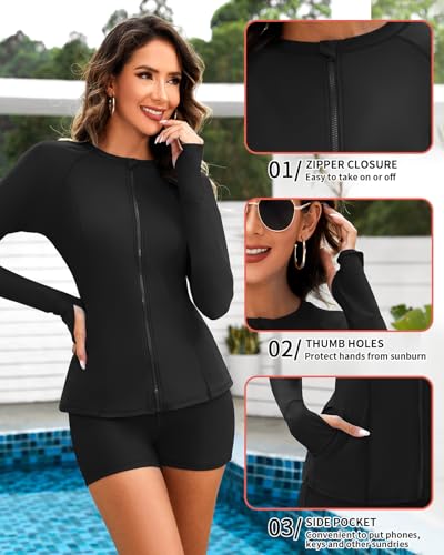 • Two Piece Zipper Women Rash Guard with Shorts: This rashguard swimsuit for women with zippers for easy on and off. The rash protective shorts are made of solid color and have a simple and stylish appearance.