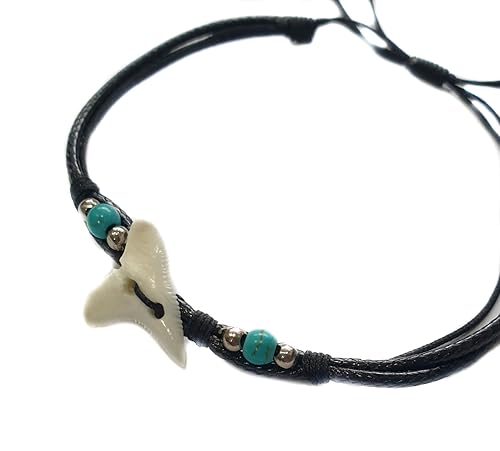 • This Shark Tooth Bracelet for Men Women features awesome genuine Mako Shark Teeth matched with waxed cords, cowrie shells and turquoise color beads to create this cool surfer beach shark tooth bracelet. This shark tooth bracelet length is adjustable from 6 to 10 inches for your perfect fit.