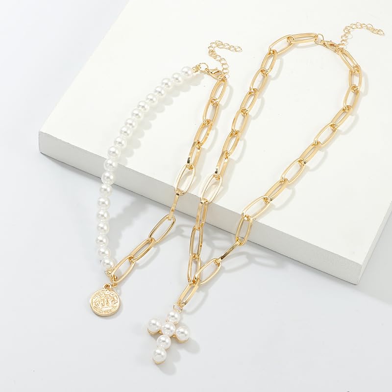 HOT ! Layered Pearl Necklace for Women Trendy Simple Necklace Gold Chain Choker Necklace Pearl Cross Necklace Tiny Gold Jewelry for Women