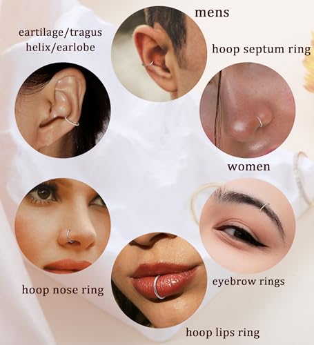 • Size Detail-----Dainty nose hoops include different gauge size 20 gauge (0.8mm); 18gauge (1mm); 16 gauge (1.2mm) . Inner of the hoop in 8mm/10mm. You can choose the best size based on your nose holes, ear holes and lip holes.