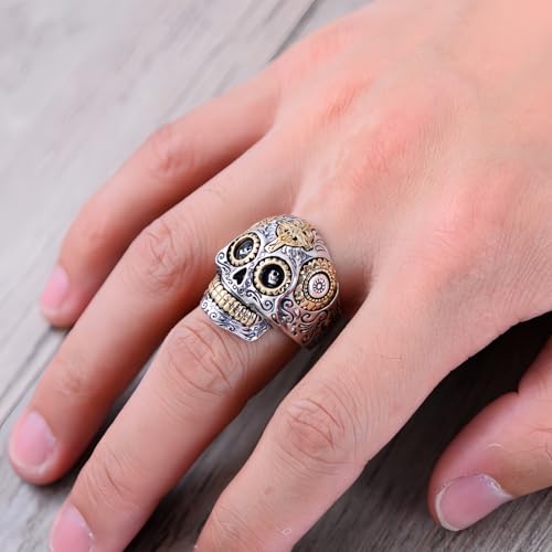 Real 925 Sterling Silver Mexican Sugar Skull Head Ring Golden Eye Cross Punk Gothic Biker Jewelry for Men Women Size 8-13 3