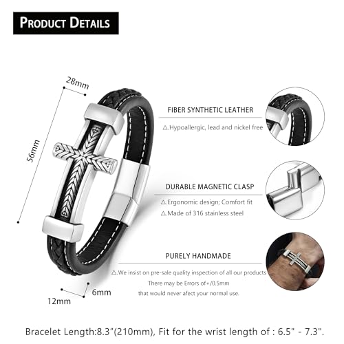 Men's Leather Cross Bracelet, Stainless Steel Religious Sideway Cross Faith Bracelet Bangle Christian Prayer Jewelry Gift for Men 6