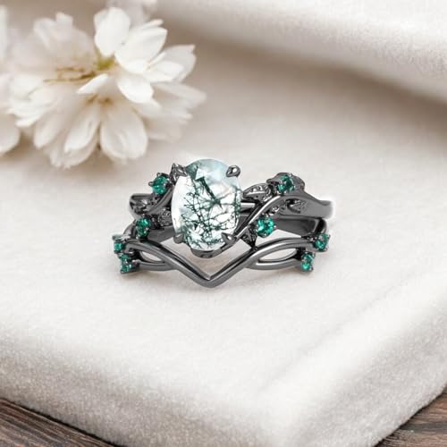 Oval Shaped Moss Agate Ring Set Black Gold Plated Silver Jewelry 2 pcs Wedding Ring Set Emerald Statement Gifts For Women 5