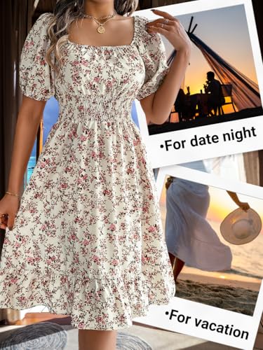 Off-The-Shoulder Dress, Floral Puff Sleeve, Knee-Length A-Line, Bohemian Flower Square-Neck Boho 3
