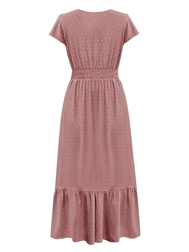 • Features:Swiss dot dresses,shirred waist dress,smocked dress women front button decoration,cap short sleeve ,long maxi dress