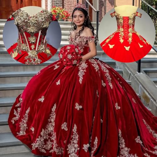 • ❤FEATURES: This is a puffy velvet quinceanera gown with golden 3d butterfly and appliques show its gorgeous.Off shoulder puffy velvet ball gown sparkly golden 3d butterfly ,velvet ball gown long with train,vestido de 15 años,sweet 15 16 dresses ,shiny 49d flower prom gown with long train, princess birthday dress,gorgeous pageant dresses,lace up closure and built in bra.
