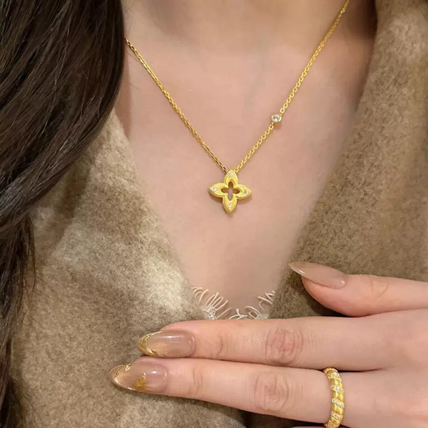 Golden wire-drawing hollow four-leaf clover necklace with a retro and high-end sense, a light luxury diamond-embedded flower necklace 1