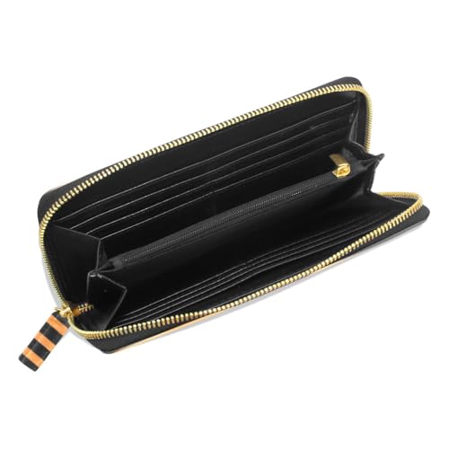 Long Wallets Leather Bifold Wallet for Women Orange Black Stripe with Zipper Credit Card Holder Large Capacity 5
