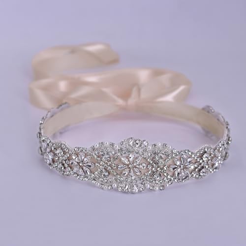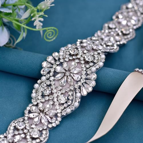 • Handmade Wedding Rhinestone Belt:Be made of different shape AAA shining silver rhinestones and pearls. 100% handmade ,soft ribbon, Every Rhinestone is pasted carefully and evenly. The exquisite structure and craft make it looks unique and distinctive. Fresh and beautiful shape,make you more charming.
