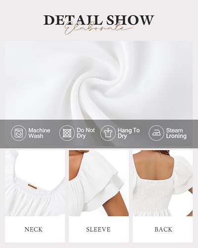 • FEATURE:This babydoll top features a retro square neck and smocked details,showcasing delicate collarbone lines and a slim fit that highlights your beautiful body curves, adding a touch of femininity and elegance.The double-layer ruffle sleeves are designed to be playful and cute, with an elastic waist and ruffled hem adding a dynamic atmosphere,making it easy to wear for dates or outings, creating a niche design sense.