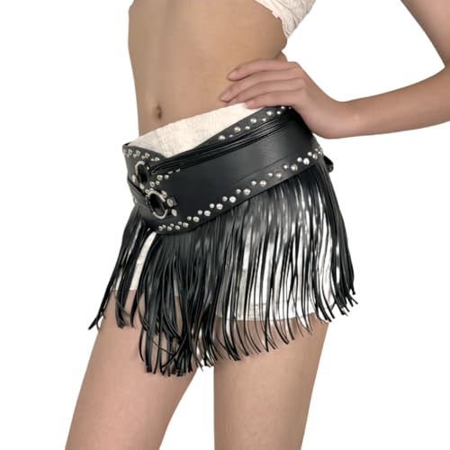 • 1. Punk Rock Style with Long Fringe This gothic fringe belt for women features edgy studded details and dramatic long tassels, perfect for a punk, boho, or western cowgirl look. The black leather-like skirt belt adds a bold statement to dresses, jeans, or festival outfits.