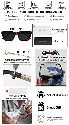 • SUPER VALUE: Trendy polarized sunglasses*1; Small screwdriver*1; Portable pouch*1; Soft sunglass cloth*1; Anti-lost sunglasses straps*1; Carefully packaged in brand box as a perfect gift for her or charming yourself! No risk to pick MARE AZZURO because of 30 days free return and refund service and lifetime warranty if any problem in the sunglasses.