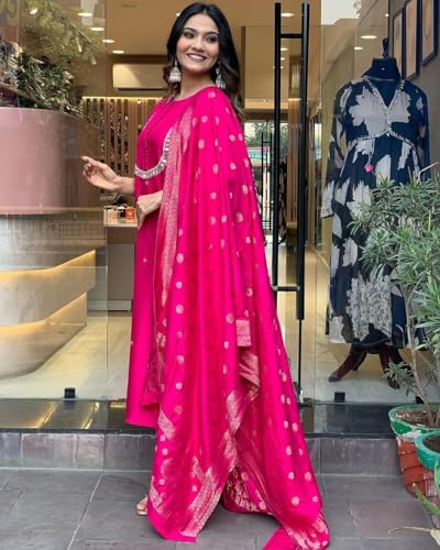HOT ! Womens Kurta Set Silk Blend Jacquard Khatali Work Stright Kurta and Pant with Dupatta Set