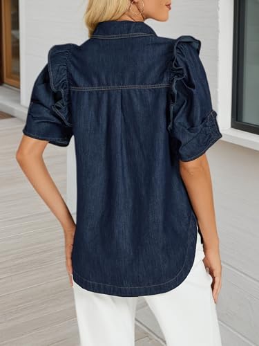 • Stylish jean shirt women button down ruffle short puff sleeve lightweight denim tops for a trendy summer look. Features a flattering v-neck, collared design, and ruffled flutter details for a chic, casual vibe