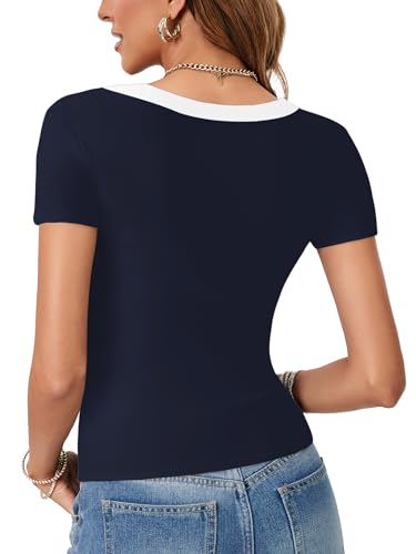 • This summer cute tee top featuring a scoop neckline with trendy color block design that is both eye-catching and flattering, sexy square neck, soft ribbed knit texture, elegant slim fit, relaxed, classic fit.