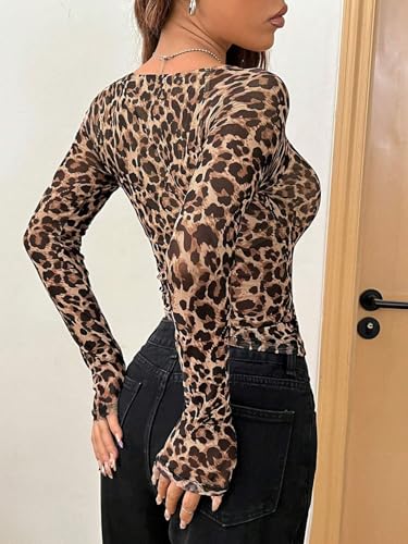 Women Leopard Print Mesh Crop Top Long Sleeve Square Neck Slim Fitted Ruched T Shirt Girls Sexy Going Out Top 6