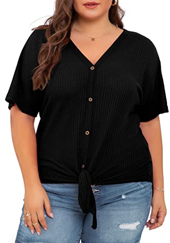 OLRIK Womens Plus Size Tops Short Sleeve V Neck Waffle Knit Tunic Blouse Tie Front Button Up T Shirts 6