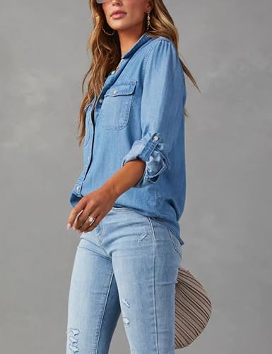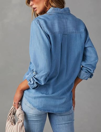• Design; This women's lightweight denim blouse features a classic button closure and long sleeves with buttons for easy rolling up, solid color, and two front pockets for a casual or formal look.