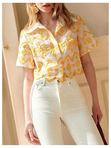 HOT ! SweatyRocks Women's Short Sleeve Button Down Collared Blouses Boho Summer Embroidery Crop Top