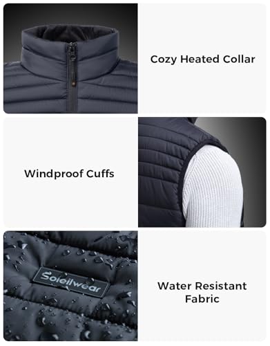 • 3 Adjustable Heat Settings & Fast Heating: Features premium carbon fiber heating elements that heat up in seconds. Soleilwear heated vest provides with 3 temperature levels (Low ~104°F / 40°C, Medium ~122°F / 50°C, High ~140°F / 60°C) to suit different weather conditions and personal preferences.One-button operation is easy even with gloves on.