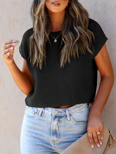 HOT ! LCXWFE Womens Summer Cropped Sweater Vest Trendy Cap Sleeve Crop Tops Crew Neck Loose Knit Tank Top