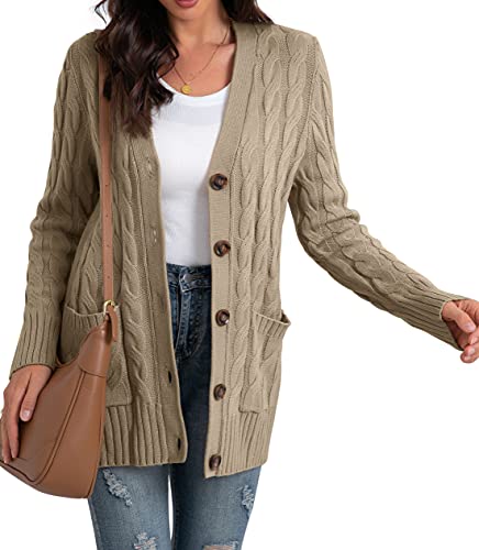 GRECERELLE Women's Long Sleeve Loose Knit Cable Open Front Button Down Cardigan Sweater Outerwear Coat with Pockets 6