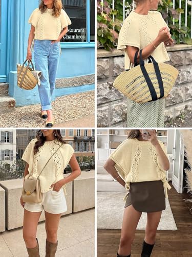 • Feature: Batwing cap sleeve, crew neck, crochet hollow out, casual loose fit, cable knit, side tie, spring tops for women 2025, summer sweater tops.