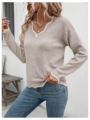 • Features: pullover sweater for women, v neck, long sleeve, drop shoulder, scallop trim, plain, loose fit, soft knit sweater for women