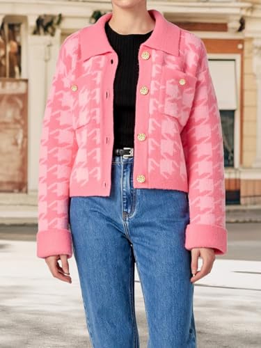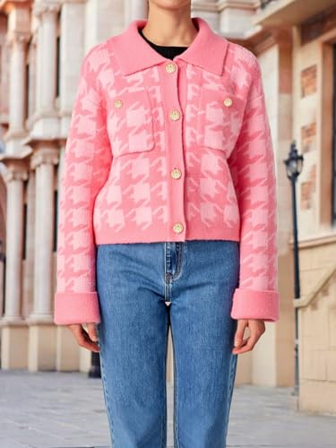 • Versatile Layering Design: This women’s pink houndstooth knit cardigan sweater jacket features a button front closure, structured collar, and turned-up cuffs, allowing this cropped knit sweater for women to adapt easily to different outfits and seasons