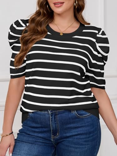 Beautife Womens Plus Size Short Puff Sleeve Sweater Tops Lightweight Striped T Shirts Summer Casual Crew Neck Knit Pullover 1