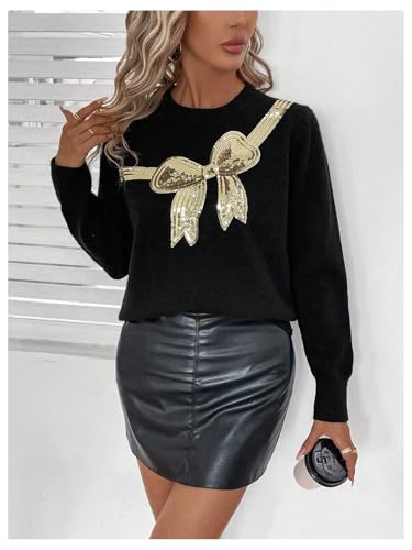MakeMeChic Women's Bow Sweater Sequin Long Sleeve Crew Neck Knitted Fall Sweaters 1
