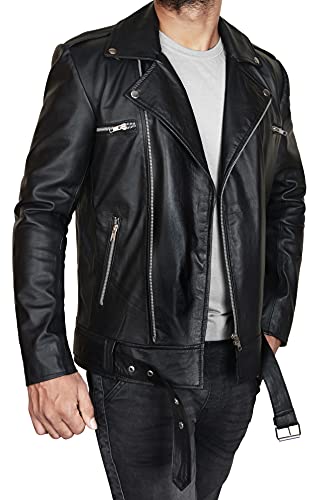 More information about Men's Lambskin Leather Biker Jacket – Slim Fit Lapel Asymmetric Zip-Up Belt Black Motorcycle Coat