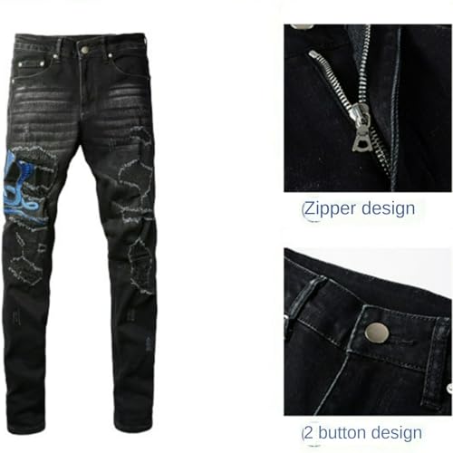 More information about Jeans Pants Trousers Denim Men Trendy Street Personalized Embroidered Snake Pattern Punched Black Elastic Tight Stretch Slim Fit Casual Small Foot(Black,33)