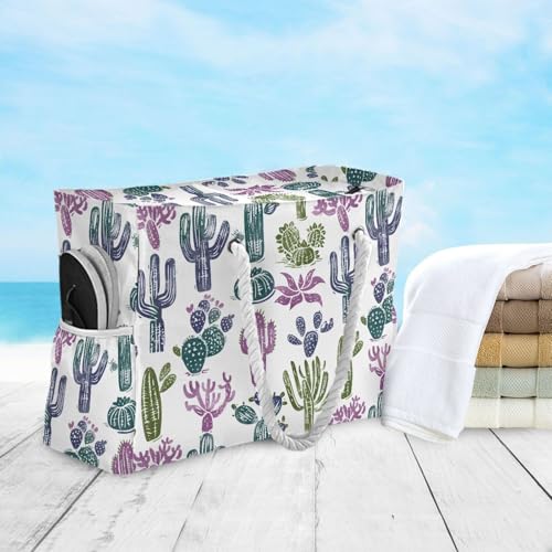 HOT ! Retro White Cactus Collection Sandproof Women Tote Bags with side pocketes Beach Bag Sandproof Outdoor for Pool Gym Grocery Travel