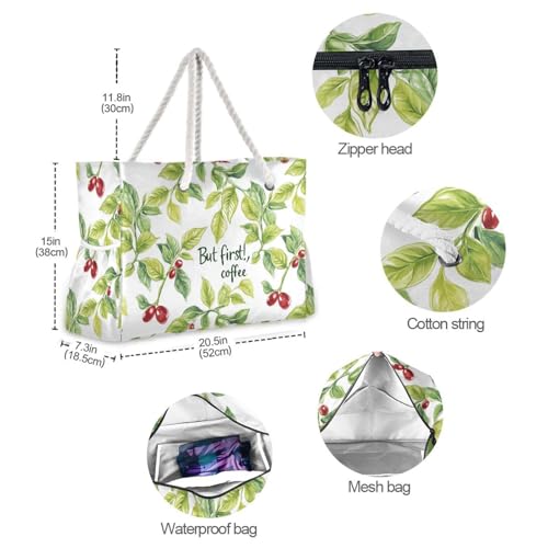 Green Coffee Plants White But First Coffee Sturdy Women Tote Bag with side pocketes Rubber Beach Bag for Pool Gym Grocery Travel 7