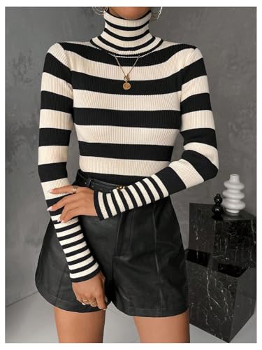 Floerns Women's Striped Print Long Sleeve Sweater Turtleneck Rib Knit Pullover Tops 1