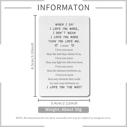 • Love Note Card: This wallet card is permanently etched, and these words will accompany you for a lifetime! They are valentines day gifts for her, valentines day gifts for him, valentines day gifts, fathers day gifts from wife, mens valentines gifts, mothers day gifts for wife, gifts for boyfriend, boyfriend christmas gifts, couples gift ideas, husband gifts, gifts for wife, boyfriend gifts, christmas gift for boyfriend, gifts for husband, christmas gifts for boyfriend