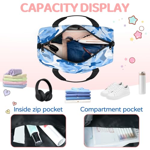 Camo Print Blue Travel Duffel Bag for Women and Men, Sport Tote Gym Bag Carry on Weekender Overnight Bags 6