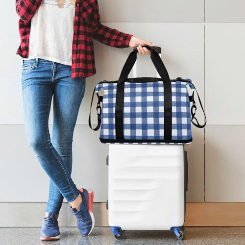 HOT ! Blue & White Gingham Gym Bag for Women Sport Travel Duffel Bag Shoulder Weekender Overnight Bags with Wet Pocket & Shoe Compartment