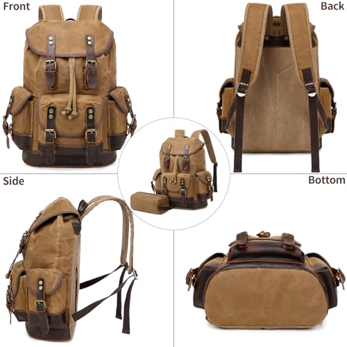 Wogarl Leather Backpack for Men, Waxed Canvas Vintage Backpack Rucksack for Business College Travel Hiking Shoulder Daypacks With Toiletry Bag(Khaki) 5