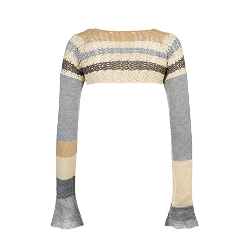 Women Wild Knitted Sweater Shrug Contrast Color Hollow-Out T-Shirt Round Neck Long Sleeve Crop Tops Streetwear 4
