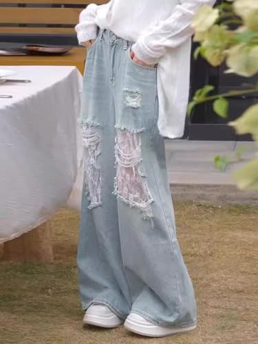 LAFOURAM Petite Jeans for Women 5 FT Short Wide Leg Baggy Y2K Lace Patchwork with Hole Denim Pants 5