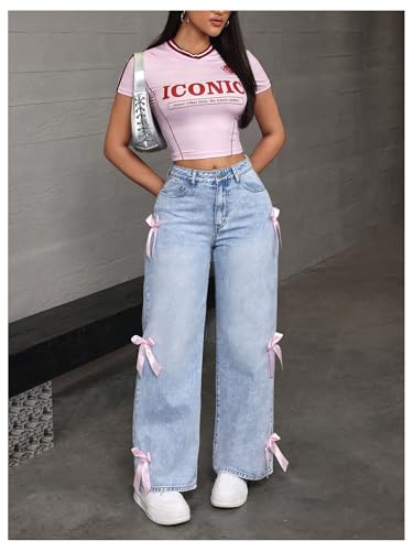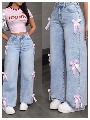 More information about MakeMeChic Women's Bow Knot Zip Up Denim Pants Loose Fit Button Front Straight Leg Jeans