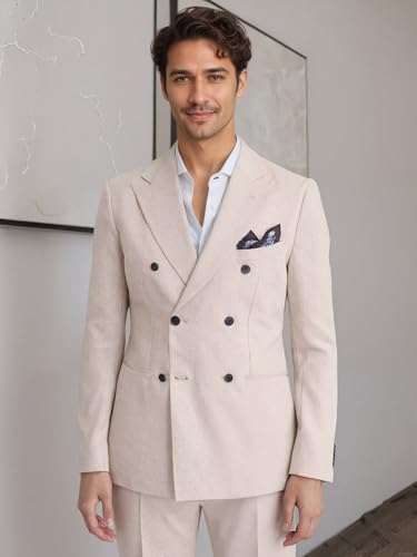 HOT ! Mens Suits Linen 2 Piece Suit for Men Lightweight Double Breasted Slim Fit Suits Set for Summer Beach Wedding Prom